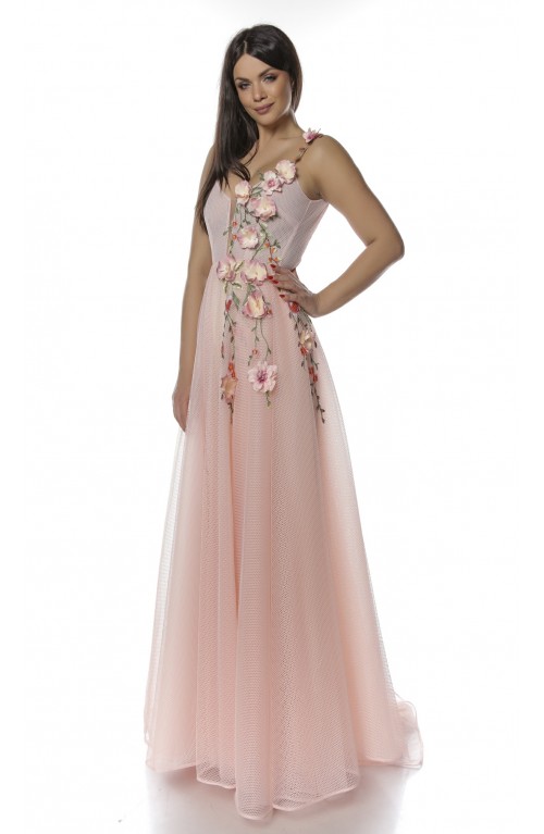 Rochie din tulle si plasa cu aplicatii manuale de flori 3D