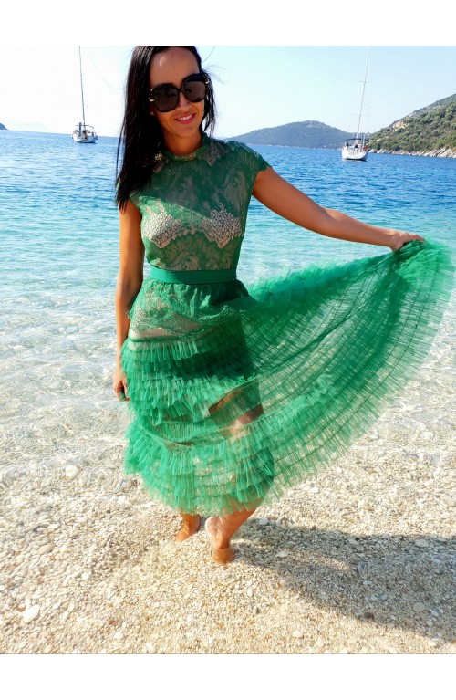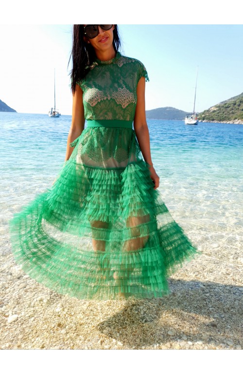 Rochie de seara lunga din voal sifon si dantela cusuta manual
