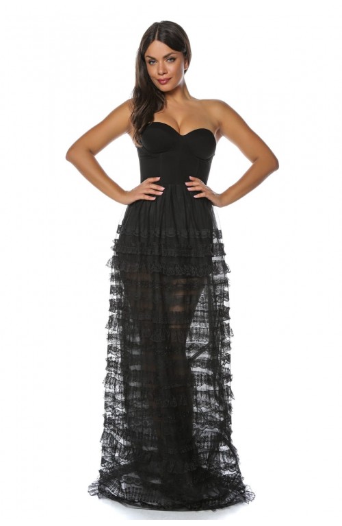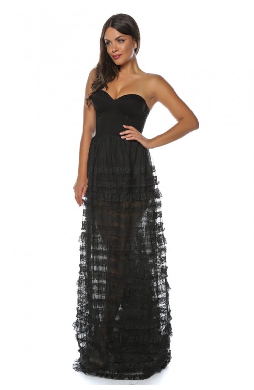 Rochia de seara lunga din crep de matase si tulle cu dantela