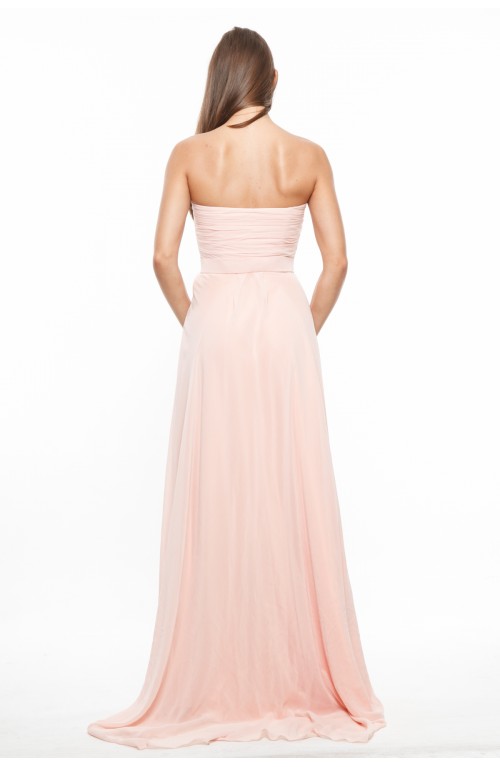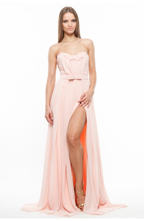 Detalii: Rochie MM de seara din voal roz cu fronseuri si centura cu funda.